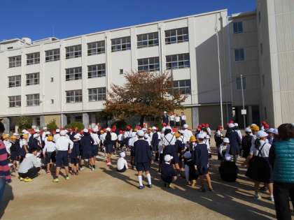 スマイル集会の音楽が鳴ると、子どもたちが運動場に下りてきます。