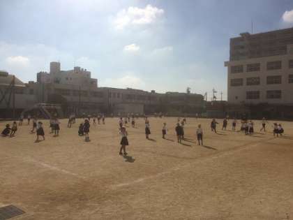 昼休みには、全学年が運動場に出て、それぞれのクラスでドッジボールをしていました。