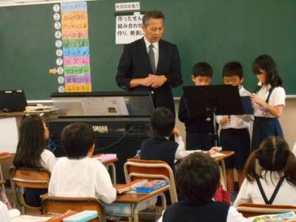 子どもたちはリコーダーでふいたり、グループ内で話し合ったりして組み合わせを考え、完成した曲をみんなの前で発表していました。