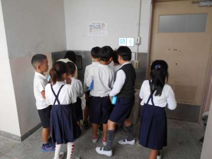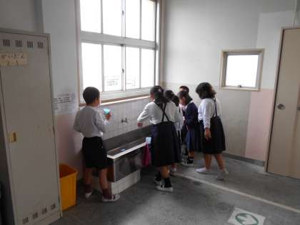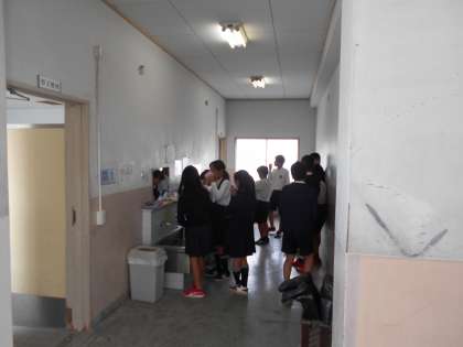 給食が終わると、すぐに手洗い場がいっぱいになります。