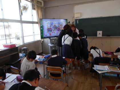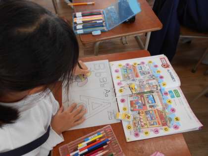 アレックス先生からアルファベットの塗り絵をもらい、色鉛筆で一生懸命にかいています。