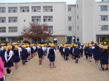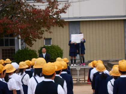 今週はあいさつ週間です。児童朝会では、あいさつ週間について呼びかけがなされました。