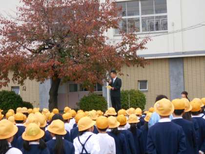 昨夜からの雨も上がり、少し肌寒い中ではありましたが、児童朝会を行いました。