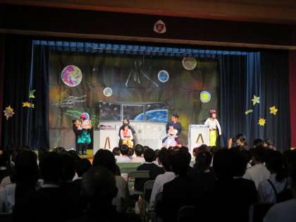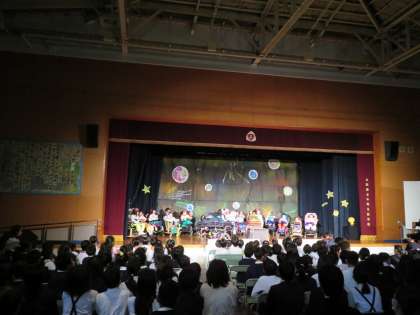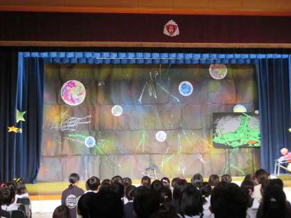 本校の2年生と5年生が招待され、平野支援学校講堂で行われる劇を見に行きました。
