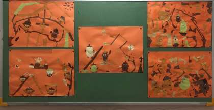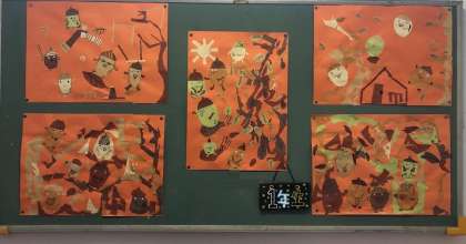 1年生の階段掲示は、どんぐりや落ち葉などをイメージした秋の様子です。