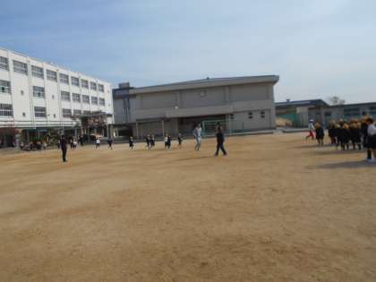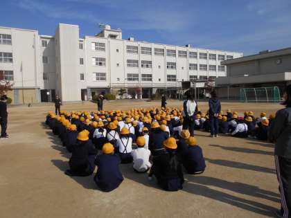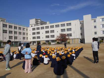 「理科室から火災発生しました。児童のみなさんは、避難の準備をしましょう。……」と放送されると、みんなハンカチで口を押えながら、速やかに運動場にも避難することができました。集合後、校長先生と新川先生から、火災の際に注意する点等について話を聞きました。