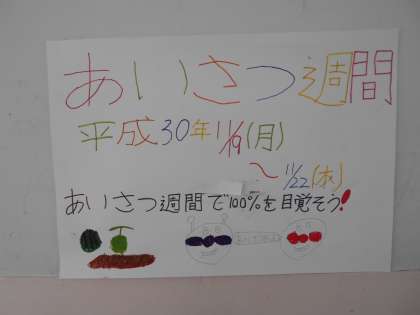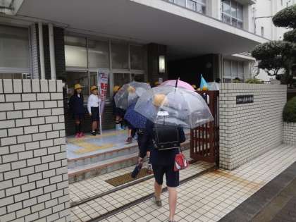 朝からあいにくの雨になりましたが、計画委員が校門付近の軒下に立って、あいさつを呼びかけていました。