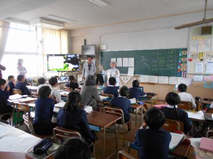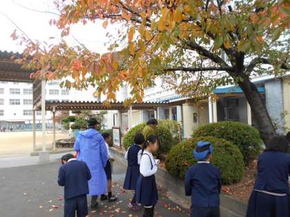 5月の“春の生きものさがし”に引き続き、“秋の生きものさがし”のため大阪市環境局の方がたくさんのボランティアの方々と共に出前授業に来てくださいました。