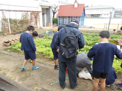 子どもたちはボランティアの方とともに運動場や長原ガーデンに出ていき、みつけた生き物の名前などを教えてもらいました。