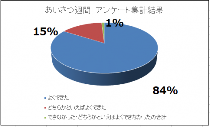 “よくできた”“どちらかといえばよくできた”の合計が99%ということで、7月と同じでした。引き続き“先に”“いつでも”あいさつできる長原っ子になってほしいと思います。
