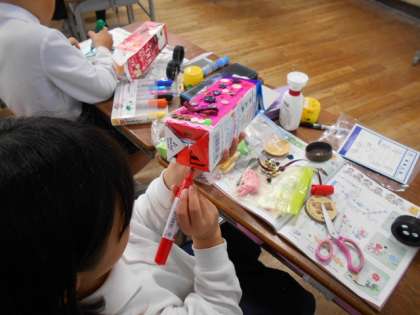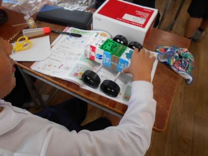 牛乳パックなどの箱にマジックなどで色付けし、それに車輪などをつけていました。