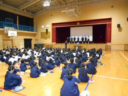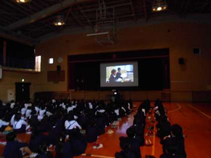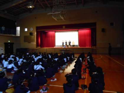 放送委員会の仕事内容や、タブレットの正しい持ち運びの仕方など、クイズを交えて楽しく紹介していました。