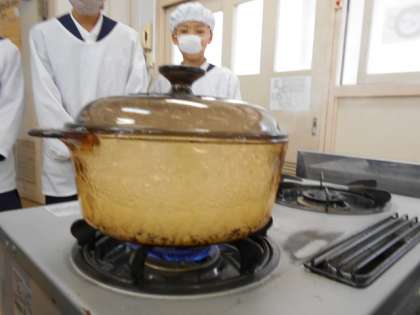 ガラスのなべで炊きながら、子どもたち炊きあがる様子を観察していました。
