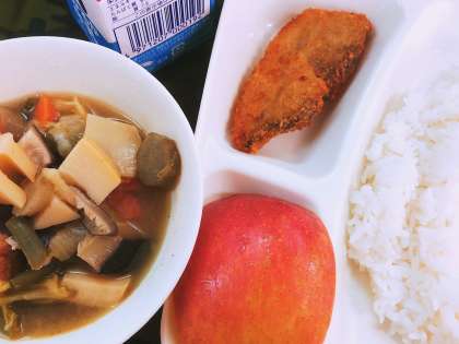 給食に出る「たらのフライ」の原材料は、スケソウダラ、パン粉、小麦粉、でんぷん、小麦タンパク、香辛料、水です。