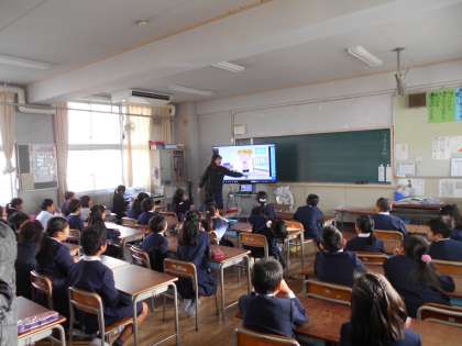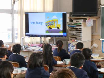 子どもたちはフラッシュカードや大型テレビの画面の英語を見て、発音できるようになってきています。