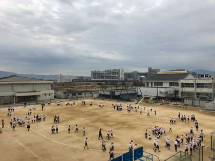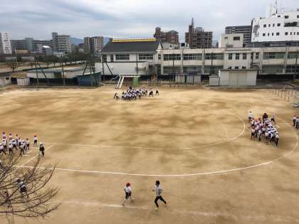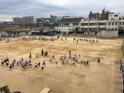 15分休みに放送が入ると、子どもたちはいっせいに運動場に出てきて準備体操をはじめ、音楽に合わせて走り出します。途中、呼吸を整えるために歩く時間も設けています。