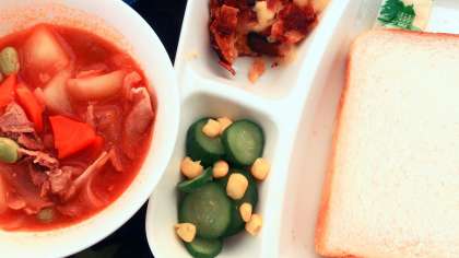 豚肉と野菜のケチャップ煮 桃のクラフティ