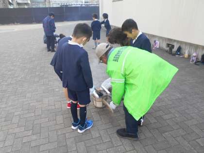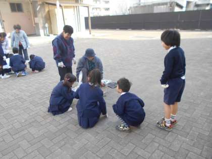 この活動は、社会科の“昔の道具”を学ぶ一環で行うもので、地域の方々がたくさん手伝いのためにお越しくださいました。