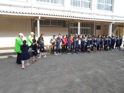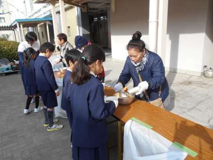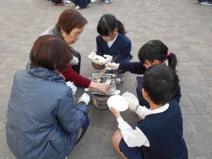 子どもたちは焼けたおもちに“きなこ”や“砂糖じょうゆ”をつけてもらい、「おいしい!」