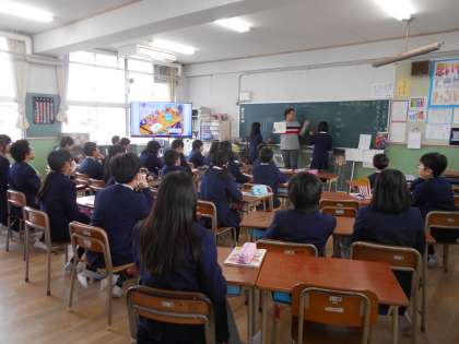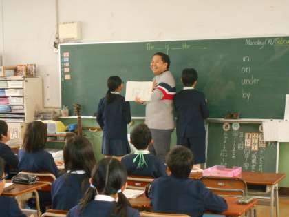 “机の上にボールがあります”や“机の下にネコがいます”などの位置を表す文を聞いて、黒板に絵をかいていました。