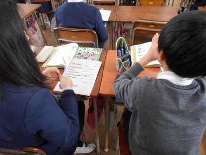 ワークシートに自分の似顔絵や好きなものなどを書き込んでいきました。