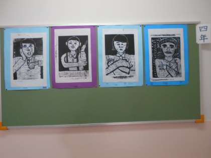 4年生の階段掲示は、“自画像”の版画です。