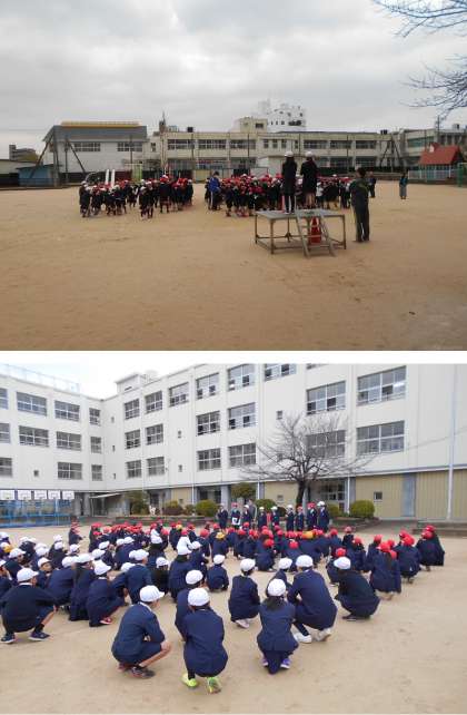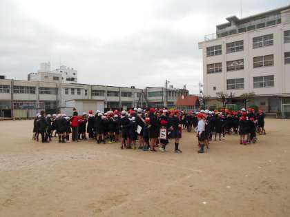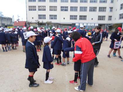 運動場はあちこちに水たまりが残り、あまりよくないグラウンド状態でしたが、全員指示をよく聞いて広がったり走り回ったりせずに、楽しく交流することができました。