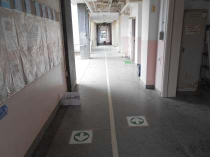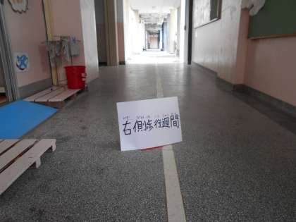 各階の廊下には、“右側歩行”を呼びかけるコーンが立ててあります。
