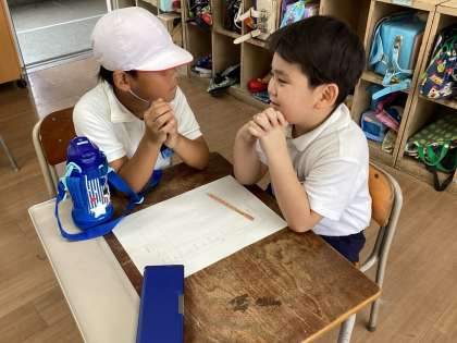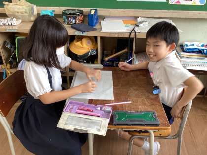 子どもたちは2人1組になって漫才の原稿を考え、読み合わせをしていました。