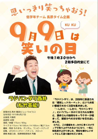 来週の9日火曜日に漫才師であるラジバンダリ西井さんが長原小学校に来られます。