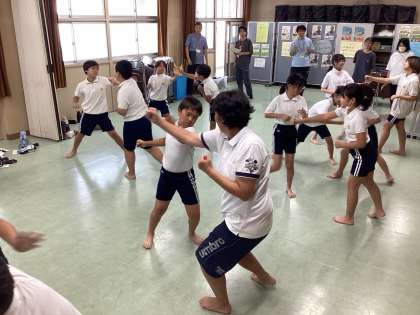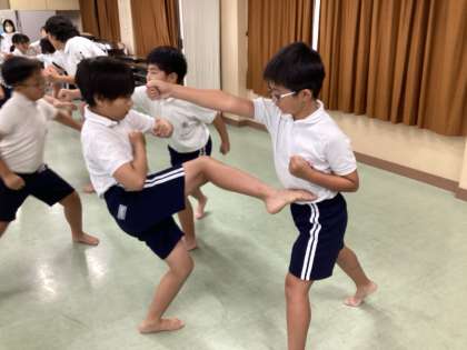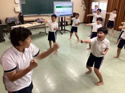 子どもたちは、少林寺拳法を用いて自己の体重や重心を利用したり、人や物など抵抗に対して、それを動かしたりすることによって力強い動きを高めることや、体の動かす楽しさや心地よさを知り、自分や仲間の体の状態に気づき、体の調子を整えたり、仲間と交流したりすることができることを学習の狙いとして体育の授業に取り組んでいます。
