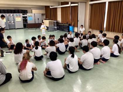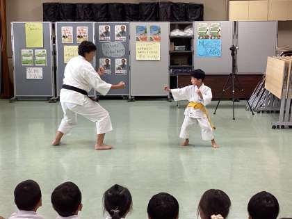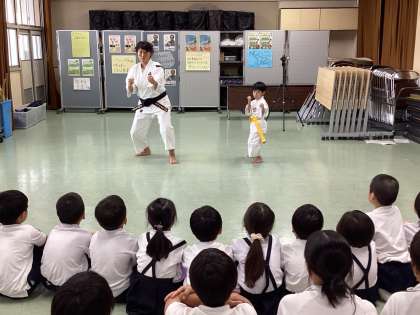 そして1年生を招待して少林寺拳法を学ぶ子どもと一緒に本校職員が型の披露をしてくれました。