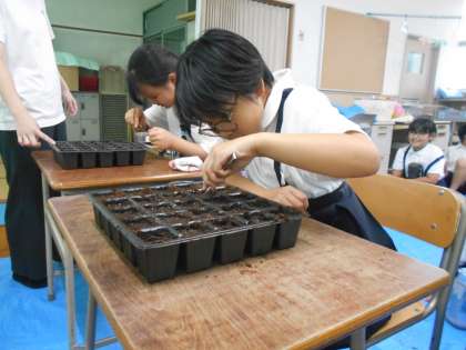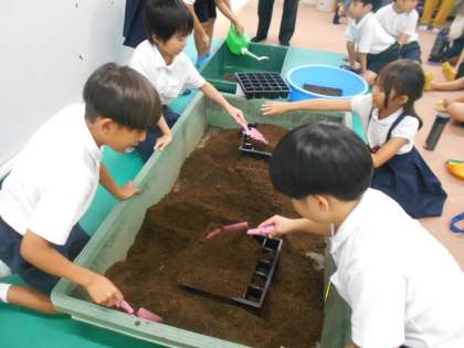 トレイに丁寧に土をいれ、ひとつひとつに根気よく種をまく子どもたち!