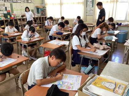 子どもたちは社会科のテストに向かって集中しています。
