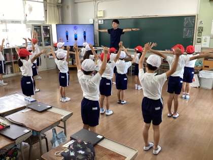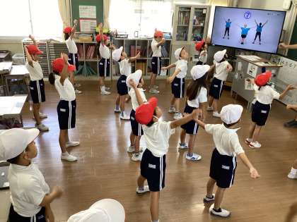 子どもたちは教室をめいっぱい使ってラジオ体操の学びにチャレンジしていました。