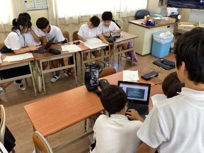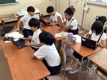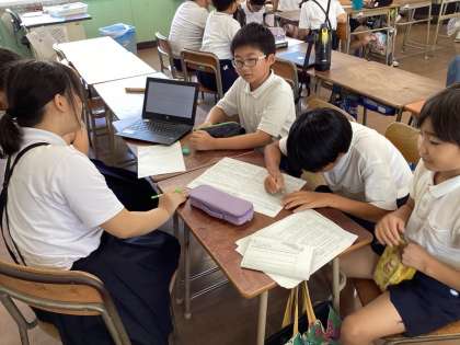 プレゼン資料の制作を入念に相談しながら考えている子どもたち。