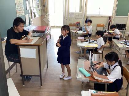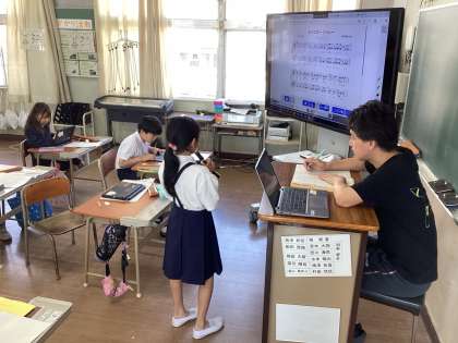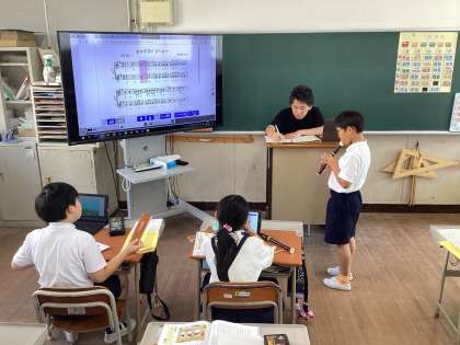 子どもたちは大型スクリーンに映る楽譜を見ながらリコーダーのテストをしていました。