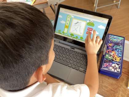 1人1台タブレットを使って書き順や字のバランスを画像を指で擦りながら学んでいる子どもたちです。