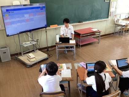 大型スクリーンには子どもたちの一人ひとりの考えが映し出されています。ICTの画面共有のシステムを使って一斉に子どもの考えを画面に映し出すことができます。