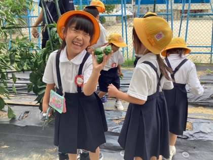 子どもたちはニコニコしながら、ピーマンをハサミで切り落としていました。