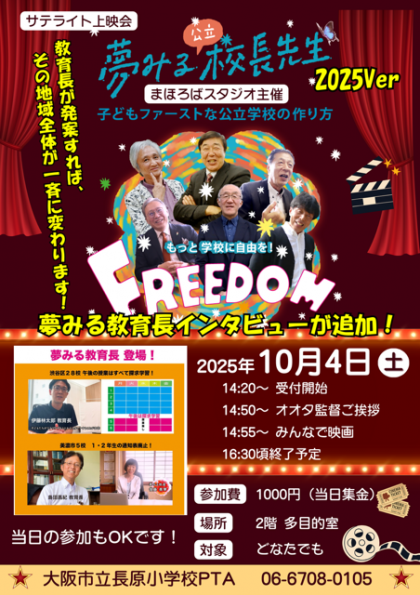 また、午後からはサテライト上映として、「夢見る校長先生!」を多目的室で行います!参加費が1000円必要です。ご興味ある方は、当日参加可能ですので、お越しください。