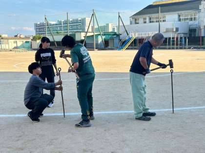 教職員が一斉に動き出します!テント設置!サッカーゴール移動!杭打ち!ロープ張り!など、「自分で考えて、自分から、動く」大人たちです!