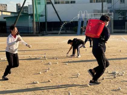 籠を背負った人を追いかけながら、玉入れを必死に楽しむ大人たち!