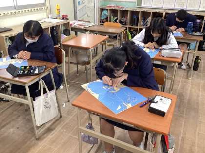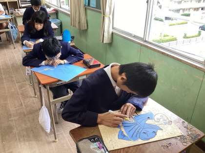 子どもたちは1人の机になって黙々と彫刻刀を動かしていました。