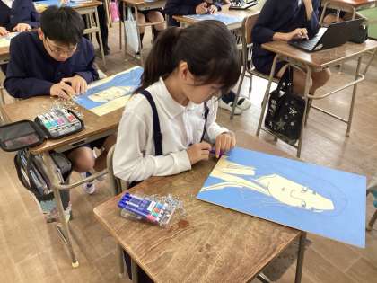歴史上の人物を一人一人が描いています。版画の作業は根気が必要です。