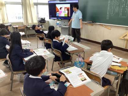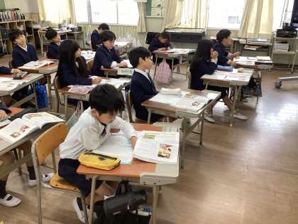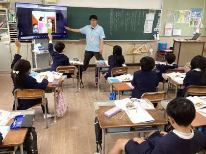 今日は3年生の道徳に4年生の先生がともに学びに来ました。