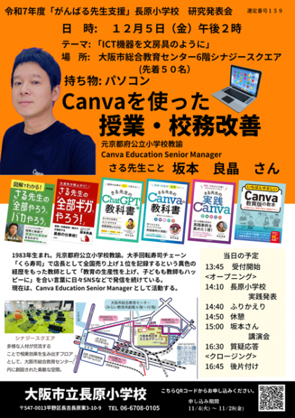 今回は本校の実践発表とともに、さる先生こと、坂本良晶さんにお越しいただき、「Canvaを使った授業や校務改善」についての講演があります。