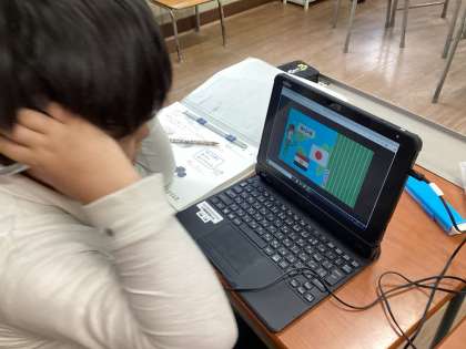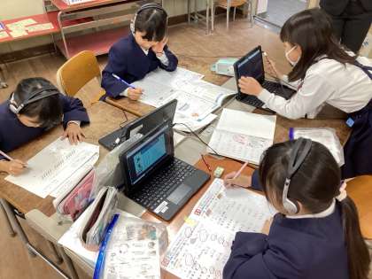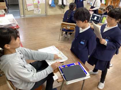 タブレットを使って個別最適な学びに挑む子どもやグループで協力して学び合う子どもや先生のところに行って、テストする子どもなどなど、様々な場面で、様々な学びの仕方で、かけ算の学びを深めています。