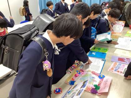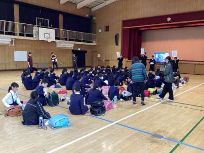はじめに体育館で生徒たちからのプレゼンを受けました。