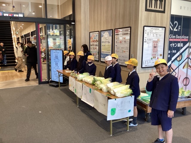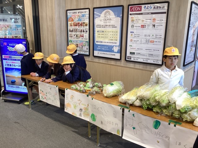 子どもたちは長原ファームで収穫した白菜を抱えて、イオンそよら長原へ「長原マート」をオープンさせました。
